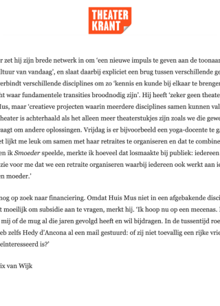 De Theaterkrant schreef een stuk over Huis Mus, de online versie lees je hier. "Acteur en theatermaker Marcel Musters is Huis Mus gestart, een creatief collectief voor de ontwikkeling van nieuwe culturele vormen tussen generaties en disciplines. ‘Ik wil een aanjager zijn voor nieuwe initiatieven en projecten die mensen dichter bij elkaar brengen.’"